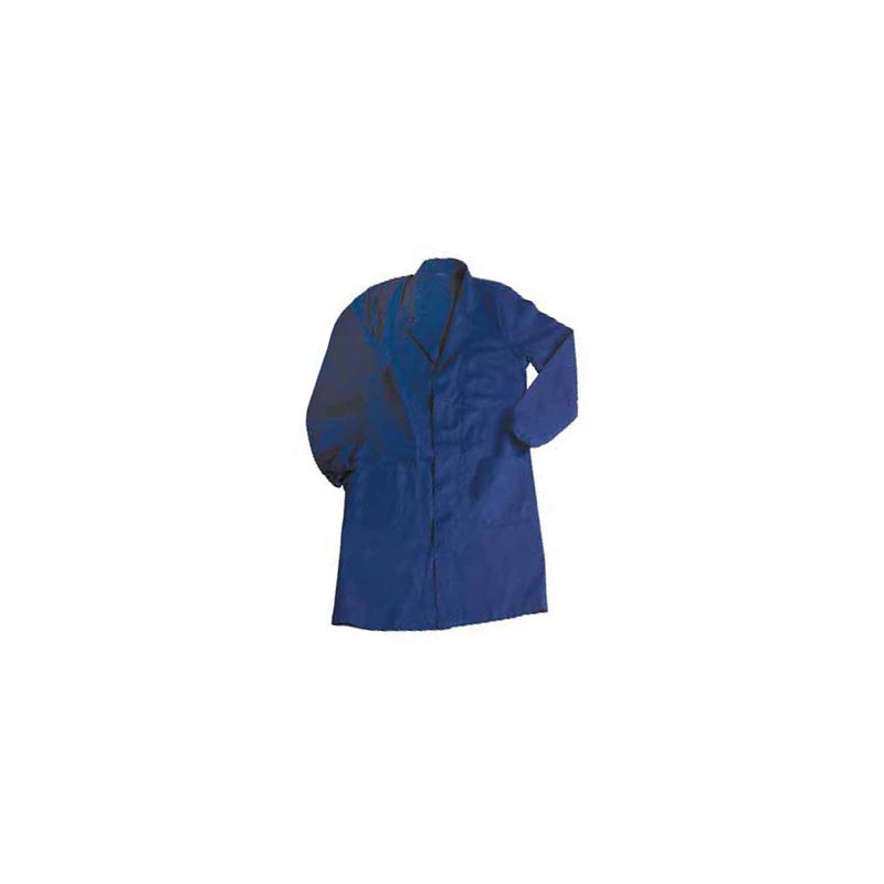 Warehouse coat 100% massaua pre-shrunk 250 g/m², two pockets and a breast pocket, flap covered buttons, cuffs with elastic. Blue color (other color available on request). Conforms to EN 13688:2013. PPE Cat. 1