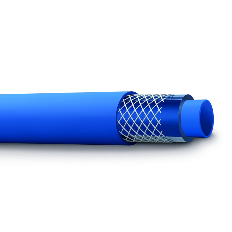 PVC hose suitable for professional washing (20 bar / 70°C) in the food industry (dairies, butchers, sausage factories, etc.). Blue underlay, high tenacity textile inserts and blue cover. It complies with the EU 10/2011 standards for contact with foods that require simulant liquids of the A B C type, detergents and disinfectants. It limits the bacterial load thanks to the internal and external antimicrobial layers. Temperature range: -20°C +70°C.
