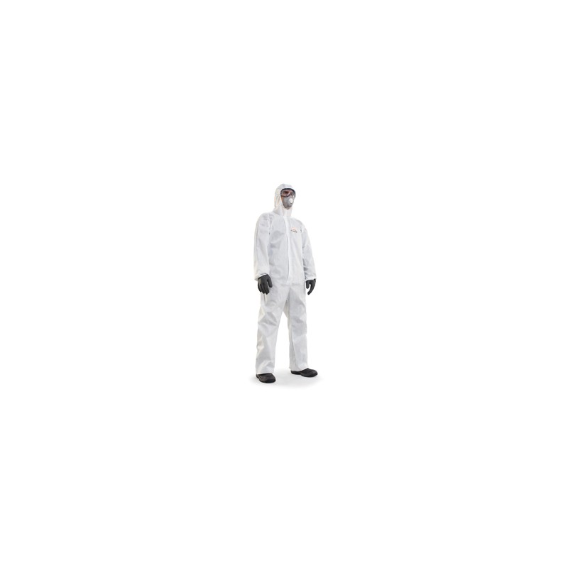 Disposable overall in breathable three-layer plypropylene, silicone and latex-free, hood in 3 pieces, clousure with special design, external flap and double-slider zip. To be used in: mechanical works, maintenance, industrial cleaning. PPE Cat. 3
