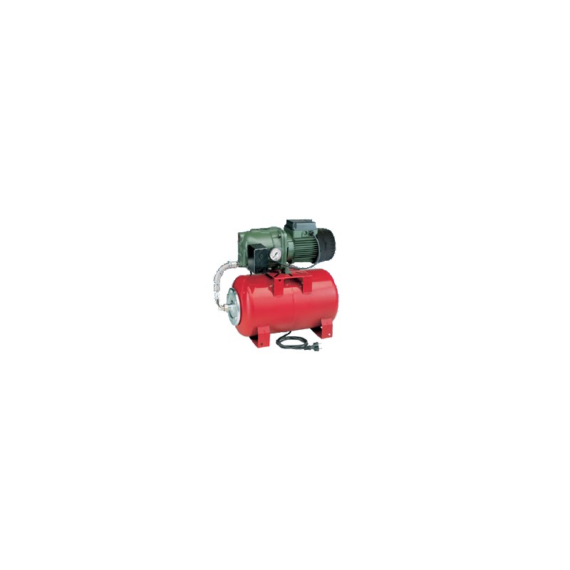 Lifting water group suitable for domestic use, small installations for agricultural and gardening, consisting of self-priming pump, pressure switch, power cable, tank-pump connector and 20 liters tank. Features: JET centrifugal electric pump self-priming; complete with fitting kit and fuel tank with the pump, already assembled; pressure switch included; cooled engine by external ventilation. Benefits: expels air bubbles in water and does not lose suction; ready to install; once calibrated the pump works automatically; compactness. Benefits: it works even in the presence of air bubbles and small amounts of sand; simplicity and ease of use; immediate use; can also be used in small spaces. Nominal Pressure bar: 8. Nominal Engine Power KW: 1. Voltage: 230V - 50Hz. Weight kg: 21.