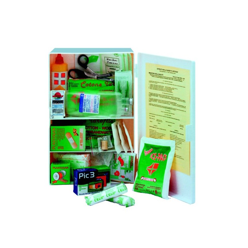 Use: for companies with less than 3 workers, which are not included in group A. Content: 1 copy fo Ministerial decree 388 of 15.07.03, 2 pairs of disposable gloves, 1 bottle of IODOPOVIDONE 125ml (10% PMC iodine) antispetic, 1 sac of sterilized physiologic solution, 3 - 18x40 cm sterilized gauze pads, 3 - 10x10 cm sterilized gauze pads, 2 packs of cotton, 1 sterilized tweezers, 1 PLASTOSAN (20 assorted bandages), 1 - 5m x 2.5 cm adhesive bandage roll, 2 - 3.5m x 10 cm gauze bandages, 1 pair of bandage cutting scissors 14.5 cm DIN 58279, 1 hemostatic string, 1 ICE PACK (disposable instant ice), 1 bag for sanitary rubbish 250 x 350 mm, 1 TNT triangular cloth 96 x 96 x 136, 1 - 160 x 210 cm gold/silver isothermal blanket, 1 PIC 3 case containing: 3 packets of liquid soap 3 antiseptic cleansing wipes 2 ammonia cleansing wipes, 1 Burn gel of 3.5 g, 1 sterile bandage pad 80 x 100 cm DIN 13151 M, 1 - 40 x 60 cm DIN 13152-BR sterile sheet, 1 MULTILINGUAL First Aid guide.