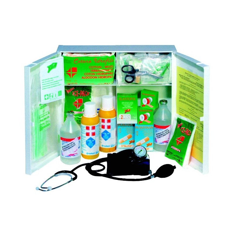 Use: for companies of group A and B, however with 3 or more workers. Content: copy of Ministerial decree 388 of 15.07.03, 5 pairs of gloves, 1 mask with squirt protecting visor, 3 bottles of sterilized physiologic solution of 500 ml CE, 2 bottles of IODOPOVIDONE 125ML (10% PMC iodine) antiseptic, 2 - 18x40 cm sterilized gauze pads, 10 - 10x10 cm of sterilized gauze pads, 2 - 40 x 60 cm DIN 13152-BR sterilized sheets, 2 sterilized tweezers, 1 pack of cotton, 1 tubular elastic band box, 2 PLASTOSAN (10 assorted bandages), 2 - 5m x 2.5 cm adhesive bandages, 2 - 3.5 m x 10 cm gauze bandages, 1 pair of 14.5 cm scissors DIN 58279, 3 hemostatic strings, 2 ICE PACK (disposable instant ice), 2 bags for sanitary rubbish 250 x 350 mm, 1 CE Thermometer with case, 1 PERSONAL sphygmomanometer with phonendoscope, 1 Multi-lingual First Aid guide.