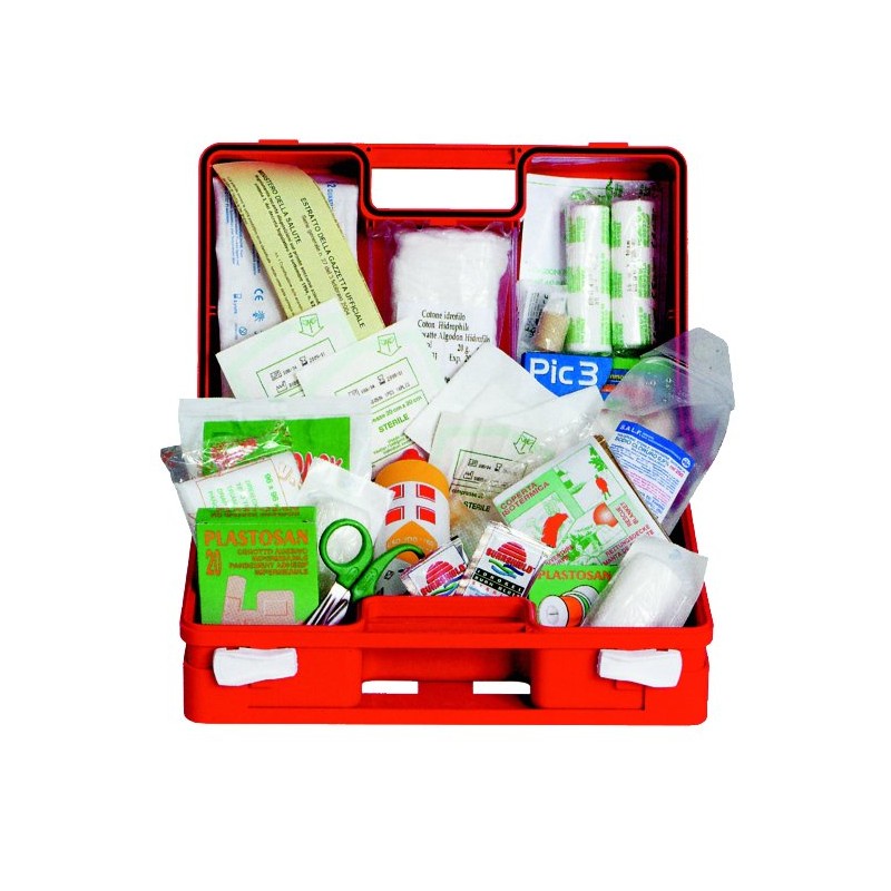 Use: for companies with less than 3 workersthat don't fall into group A. Content: 1 copia decreto Min. 388 del 15.07.03, 1 copy of Ministerial decree 388 of 15.07.03, 2 pairs of sterile gloves, 1 - 125 ml IODOPOVIDONE (10% PMC iodine) antiseptic bottle, 1 - 250 ml CE physiological solution sac, 3 - 18x40 cm gauze pad, 3 - 10x10 cm gauze pad, 1 cotton pack, 1 PLASTOSAN (20 assorted bandages), 1 sterile tweezers, 1 - 5 m x 2.5 cm adhesive bandage roll, 2 3.5 m x 10 cm conforming gauze roll, 1 pair of 14.5 cm DIN 58279 scissors, 1 hemostatic string, 1 ICE PACK (disposable instant ice), 1 - 250 x 350 mm sanitary rubbish sac, 1 - 96 x 96 x 136 cm TNT triangular cloth, 1 - 160 x 210 cm gold/silver isothermal blanket, 1 PIC 3 box container: 3 packets of liquid soap 2 sterile bandage mm 80 x 100 DIN 13151 M 2 Burn gel of 3.5 g 1 sterile sheet cm 40 x 60 DIN 13152-BR, 1 Multi-lingual First Aid guide.