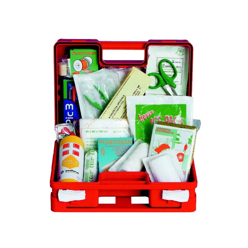 Use: for companies with less than 3 workers, which are not of group A. Content: 1 copy of Ministerial decree 388 of 15.07.03, 2 pairs of sterilized gloves, 1 bottle IODOPOVIDONE 125ML (10% PMC iodine) antiseptic, 1 sac of 250 ml physiological solution, 1 - 18 x 40 cm gauze pad, 3 - 10 x 10 CM gauze pad, 1 pack of cotton, 1 sterile tweezers, 1 PLASTOSAN (10 assorted bandages), 1 - 5m x 2.5 cm adhesive bandage roll, 1 - 3.5 x 10 cm gauze bandage, 1 pair of scissors cm 10 FOR078, 1 hemostatic string, 1 ICE PACK (disposable instant ice), 1 - 250 x 350 bag for sanitary rubbish, 1 Multi-lingual First Aid guide.