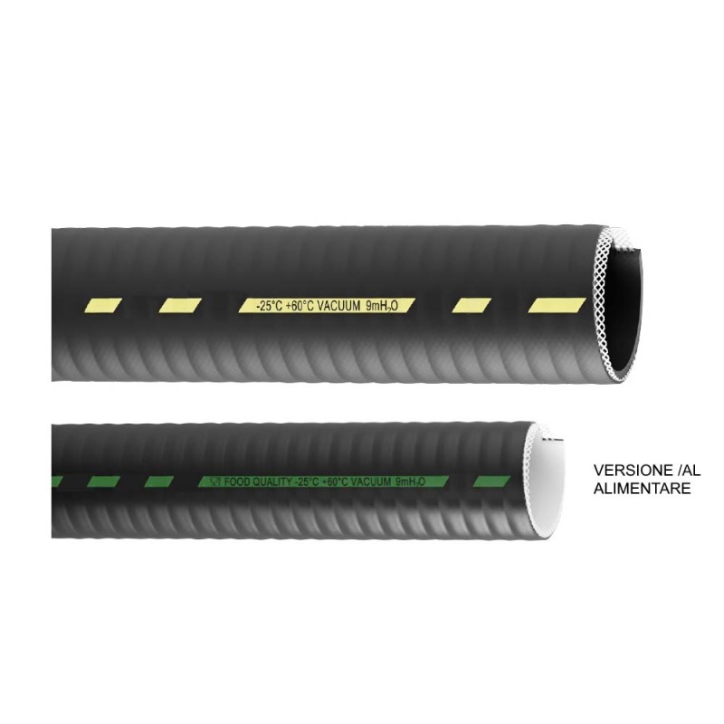 PVC hose, black tube and cover, with galvanized steel spiral. Used for water and non corrosive liquids suction and discharge. Bending radius 3 times the inside diameter. Temperature range: -25°C +60°C. Other sizes available on request. NOTE: Also available in AL version = for foods, with white inner layer in i.d. from 19 to 152 mm.