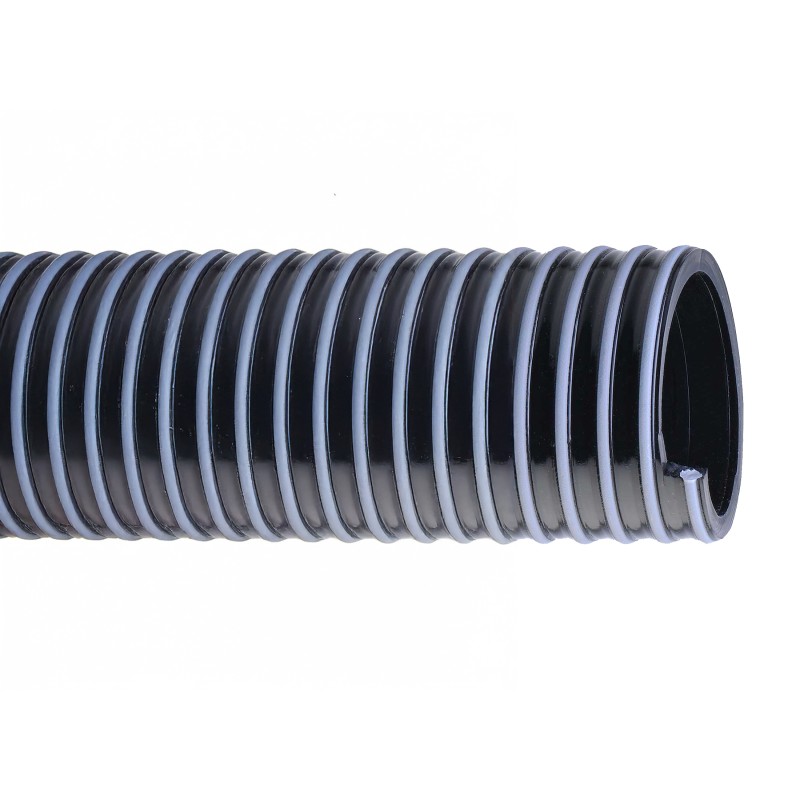 Black PVC/NBR hose reinforced with grey stripe anti-shock rigid PVC spiral. For industrial water and for use on irrigation system, sink drainage, sewers cleaning suction and discharge, even at very low temperature. Available in other sizes and in antistatic version upon request. Temperature range: -40°C +50°C.