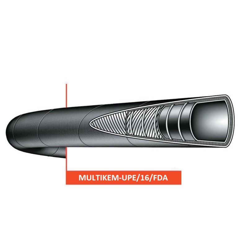 Multi-purpose hose for suction and delivery of acids, bases, ketons, aldheyds, esters, aromatic, aliphatic and chlorinated hydrocarbons. Used also for foodstuff. Smooth UHMWPE (ultra high molecular weight polyethylene) inner layer. High tensile synthetic plies, embedded steel wire spiral. Black conductive rubber cover weather, ozone and abrasion resistant, flame resistant according to TRbf 131 Teil 2 par. 5.5. Smooth with textile finish outer layer. Contact our technical department to check the compatibility of the hose with the working temperatures and the fluids to be conveyed. According to EN 12115 - 1999 - type Ω/T. Food hose complying with FDA standards.