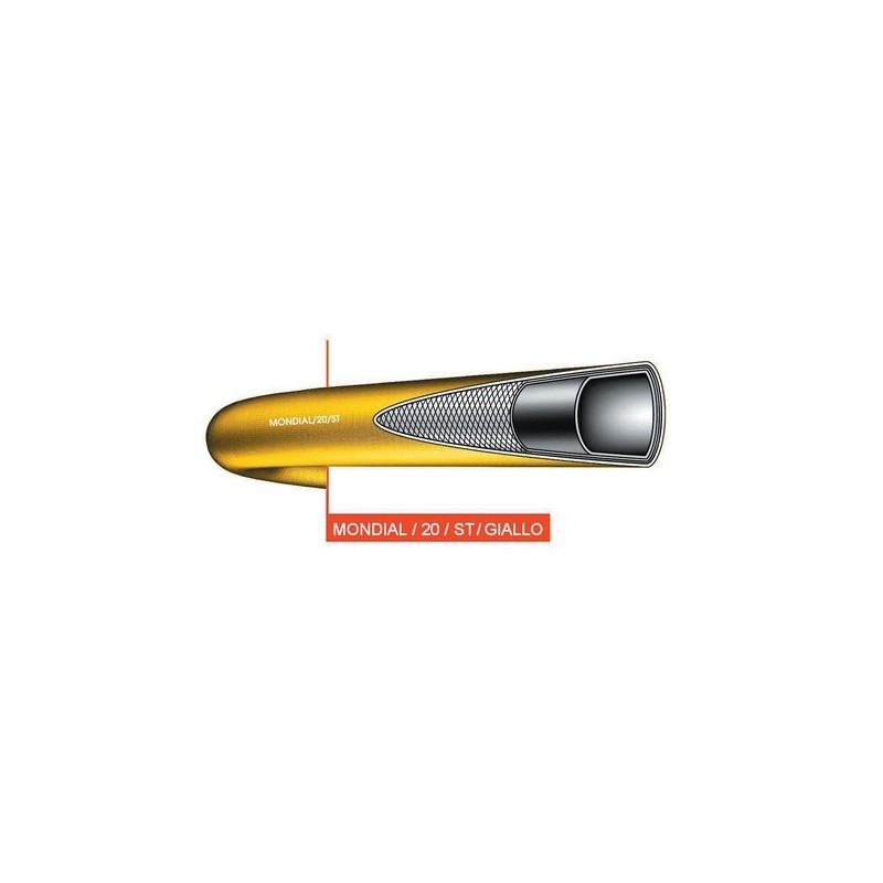 Hose for compressed air, water and non corrosive fluids delivery. Black, smooth TIPRENE elastomer inner layer with great mechanic features, air tight. Polyester yarn reinforcement. Yellow, smooth TIPRENE elastomer outer layer abrasion and ageing resistant. Long length construction. Temperature range: -10°C +60°C. Other dimensions, lengths and colors available on request.