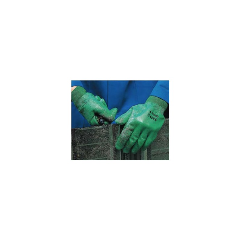 In heavy duty nitrile, palm thumb and index finger in Kevlar®. Application: mechanical works, welding, building industry, sharp metal handling, garbage handling. PPE Cat. 2