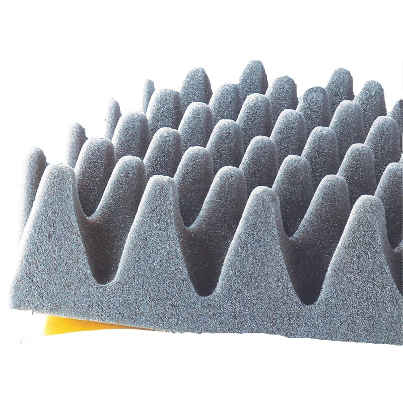 Produced in foamed polyurethane dens. 0,30 kg./dm³, self-extinguishing (as UL 94 HF1 standard), grey anthracite color, suitable for employment from -40°C to +120°C. Available in ashlar version in sheets size 1.000 x 2.000 mm thickness 20+20 mm. (base + ashlar) also with an adhesive side. (On request available smooth sheets, with lead insertions, joined with different materials, with filmed or painted or aluminized surface, sizes from 1.000 x 1.000 mm for heavy versions and rolls h. mm 1.500 for homogeneous versions)