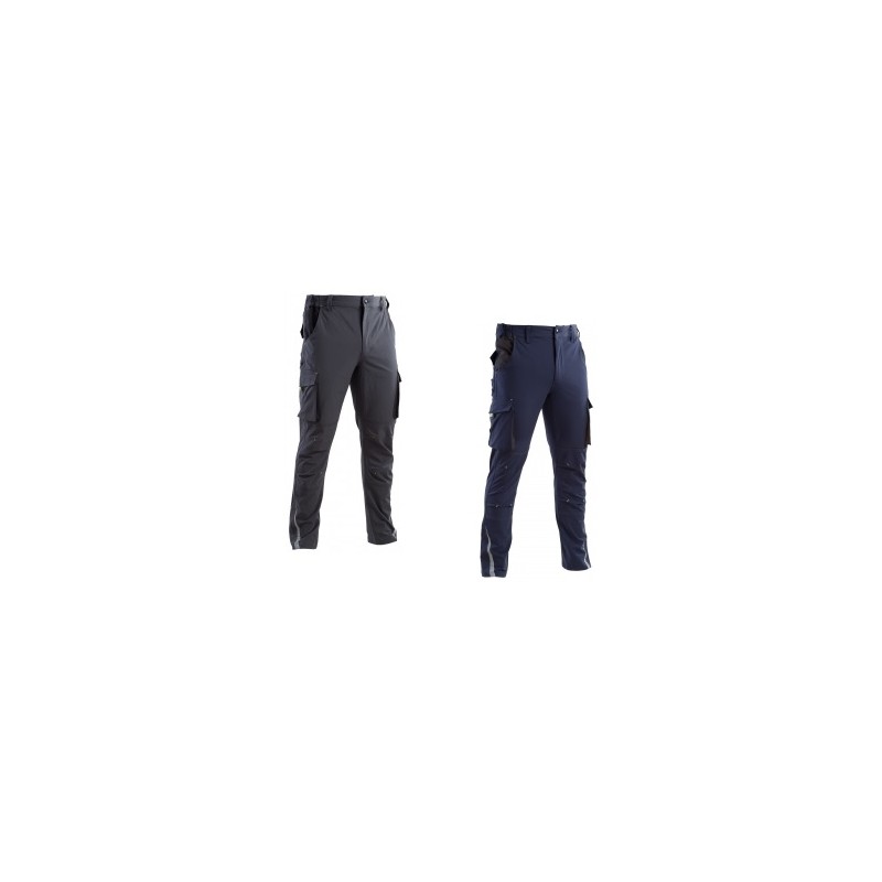 Superstretch trousers with elastic at the hips, reflective details on the bottom of the leg, bartacks in fluorescent yellow, pre-shaped knees, central closure with zip and button, 2 front welt pockets, double side pocket with flap closed by velcro, 2 back pockets with flap and velcro, double stitching in the points of greatest effort. Fabric: 90% nylon / 10% spandex, weight 260 gsm. Standard: UNI EN 13688: 2013. Sizes available: from S to 3XL. Available colors: blue/gray, gray/black.