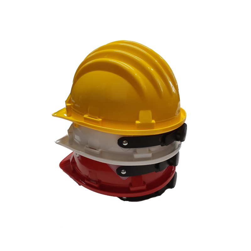 Polyethylene helmet, with adjustable roller and plastic cap and sweat band. Available in white, blue, yellow and red. According to EN 397.