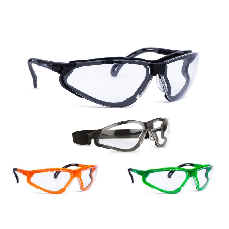 Eyeglasses with a modern and innovative design, extremely light. Anti-scretch and anti-fog polycarbonate lens. They are supplied with additional strip that guarantees optimal fixing to the face (like mask). Other colors available on request. Conforms to standard: EN166.