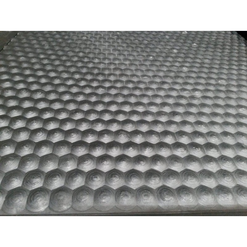 Rubber plate with anti-slip exhagonal design upper surface and lower surface with adhesion pins, easy to place, used for stables floors and vehicles for animal transport coating. Suitably designed to resist abrasion and chemical aggression of sewage; appropriate texture to provide excellent resistance to planar flexion. Standard dimensions mm 1870x1260, thickness mm 30. On request it can be supplied with designed holes and cracks parallel to the sewage outlets of the floor and in different sizes.
