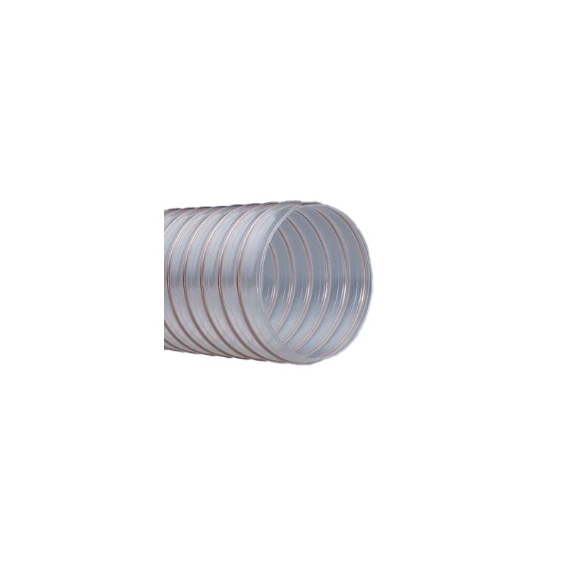 Lightweight transparent polyurethane hose with copper-plated steel spiral. Extremely flexible, good resistance to abrasion, torsion and elongation. It can be supplied compressed for easy transport and storage and made anti-static by earthing the spiral. Use: suction and conveyance of dust, chips and abrasive materials in general. Operating temperature: -40°C +90°C.