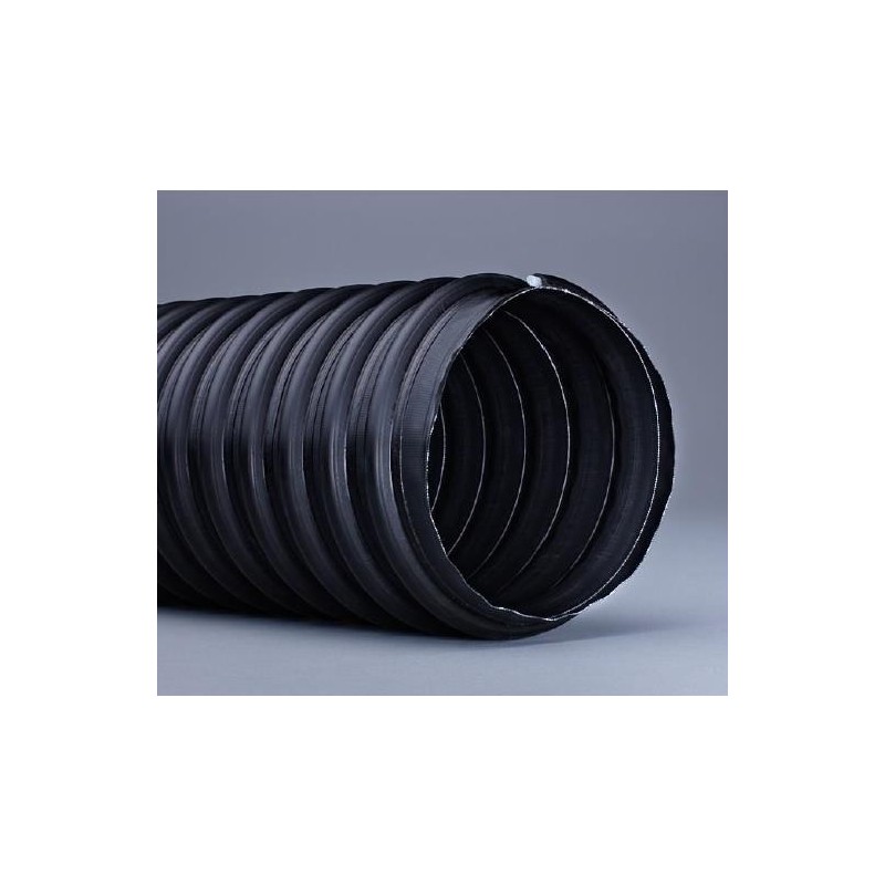 Black flexible hose for high temperatures, made of TPE coated polyester fabric, reinforced with a crush-resistant polyamide (Nylon 6.6) spiral. Excellent chemical resistance, especially to oil, petrol and gas fumes. Applications: Suitable for use in hose reels, the hose is ideal for conveying exhaust fumes from vehicles when stopped with the engine running in workshops and closed environments. Operating temperature -40°C +150°C (peaks of +170°C).