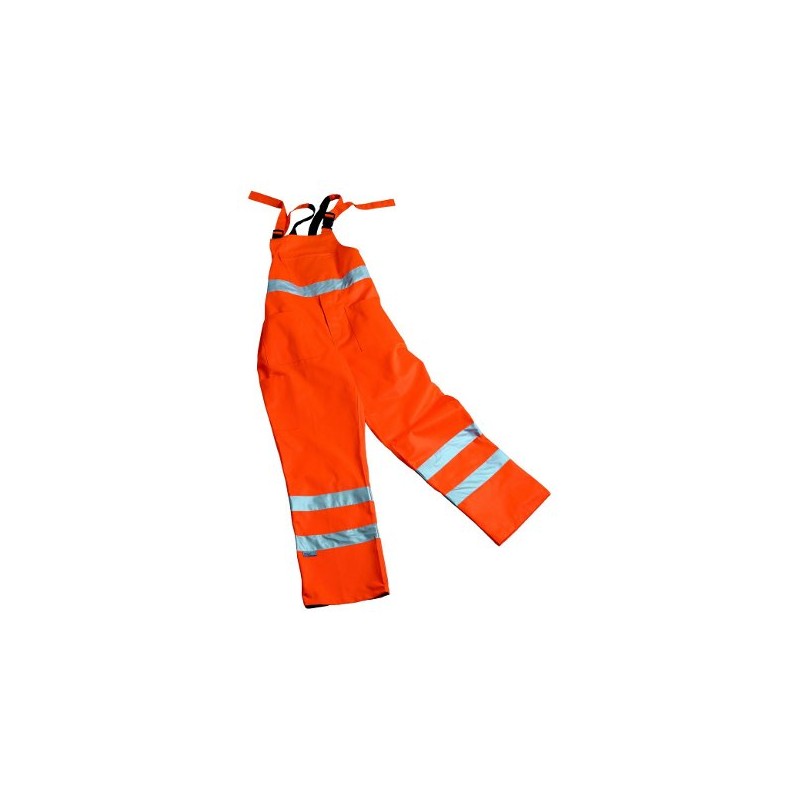 Pettorina in 60% cotone 40% poliestere peso 350 gr/mq, chiusura patta con bottoni coperti, apertura laterale chiusa con due bottoni, elastico in vita, due tasche anteriori, una posteriore chiusa con bottone, tascone sulla pettorina con cerniera, bretelle regolabili con fibbia in plastica, tasca portametro, doppie cuciture nei punti di maggior sforzo. Capo confezionato con bande rifrangenti 3M Scotchlite 8910. DPI di 2ª categoria, conforme alla norma UNI EN13688: 2013 e UNI EN 20471: 2013 - classe 2.