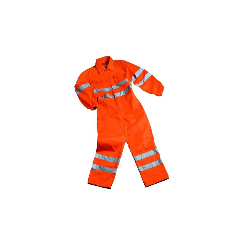 Tuta in 60% cotone 40% poliestere peso 350 gr/mq, collo a camicia, chiusura anteriore con cerniera, elastico posteriore in vita, due taschini al petto chiusi con pattina e bottone, due tasche anteriori, una tasca posteriore chiusa con bottone, tasca portametro, doppie cuciture nei punti di maggior sforzo. Capo confezionato con bande rifrangenti 3M Scotchlite 8910. DPI di 2ª categoria, conforme alla norma UNI EN 13688: 2013 e UNI EN 20471: 2013 - classe 2.