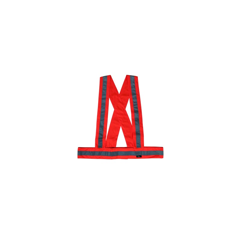 Bretella in tessuto 100% poliestere fluorescente con applicazione di bande rifrangenti, taglia unica, regolazione e chiusura con velcro. Conforme alla normativa EN471+A1.