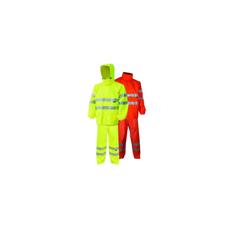 Completo antipioggia 1005 poliestere 150D Oxford con spalmatura in poliuretano e cuciture nastrate. Giacca: due bande riflettenti orizzontali, sistema di aerazione posteriore, due tasche laterali con bottoni a pressione. Pantalone: due bande riflettenti, accessi laterali per le tasche, fondo regolabile con bottone a pressione. Conforme alla norma UNI EN 20471:2013, EN 13688:2013 e EN 343:2008.