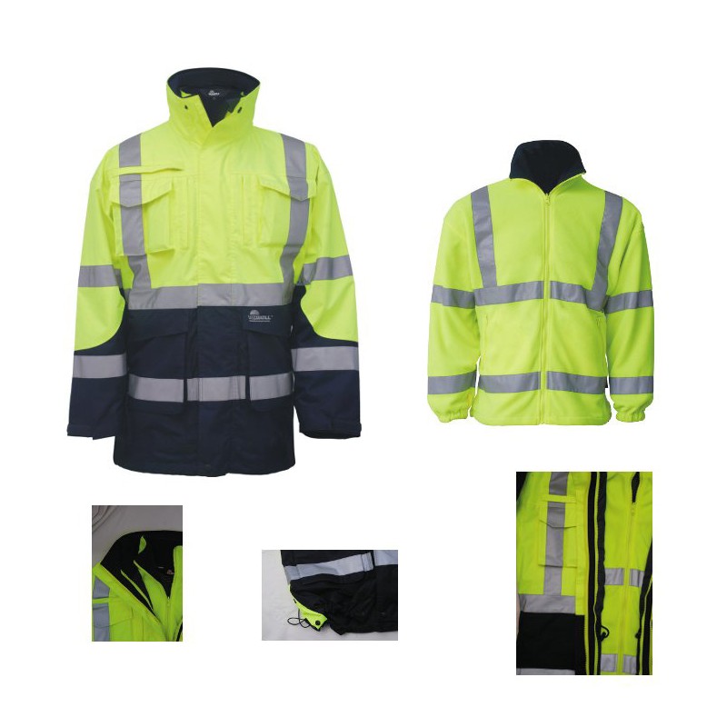 Esterno: 100% poliestere 300D, tessuto Oxford con spalmatura in poliuretano, RIPSTOP, elevata traspirabilità, impermeabile. Interno giacca 100% poliestere. Apertura laterale del fondo con chiusura a pressione. Tasche multifunzione esterne. Tasca napoleone con zip nascosta. Tasca napoleone interna con zip nascosta. Coulisse sul fondo polsini regolabili con velcro. Con portabadge. Interno: giacca staccabile alta visibilità in pile 300 gr/mq, tessuto antipilling, zip lunga. Due tasche laterali con cerniera. Polsini con elastico. Coulisse elastica sul fondo. Interno in tessuto mesh (maglia a rete) 100% poliestere. Interno in pile fornito a parte, ma solo in abbinata al giaccone. DPI di 2ª categoria conforme alla norma EN 471 e EN 343.