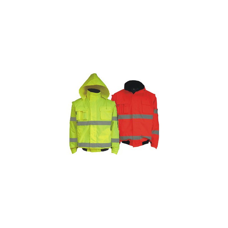 Giubbino pilot in 100% poliestere 300D tessuto Oxford con spalmatura in poliuretano impermeabile. Interno imbottito 100% poliestere foderato. Interno collo in micropile blu, maniche staccabili, cuciture nastrate, chiusura con zip e pattina antivento, due tasche laterali, una tasca multifunzione sul petto, una tasca sul petto ed una tasca interna, porta cellulare, tre porta penne, cappuccio estraibile. Con portabadge a scomparsa nel taschino esterno. Zip interna per personalizzazioni. Elastico in vita. Conforme alle norme UNI EN 20471:2013 classe 3 (senza maniche classe 2), EN 13688:2013 e EN 343:2003+A1:2007 Classe 3 1.