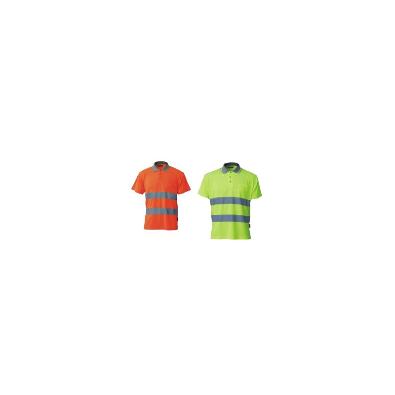 Polo in poliestere 100%, fondo manica cucita, taschino anteriore applicato, collo chiuso da tre bottoni, bande rifrangenti cucite. DPI di 2ª categoria, conforme alla norma EN 471 - classe 2.