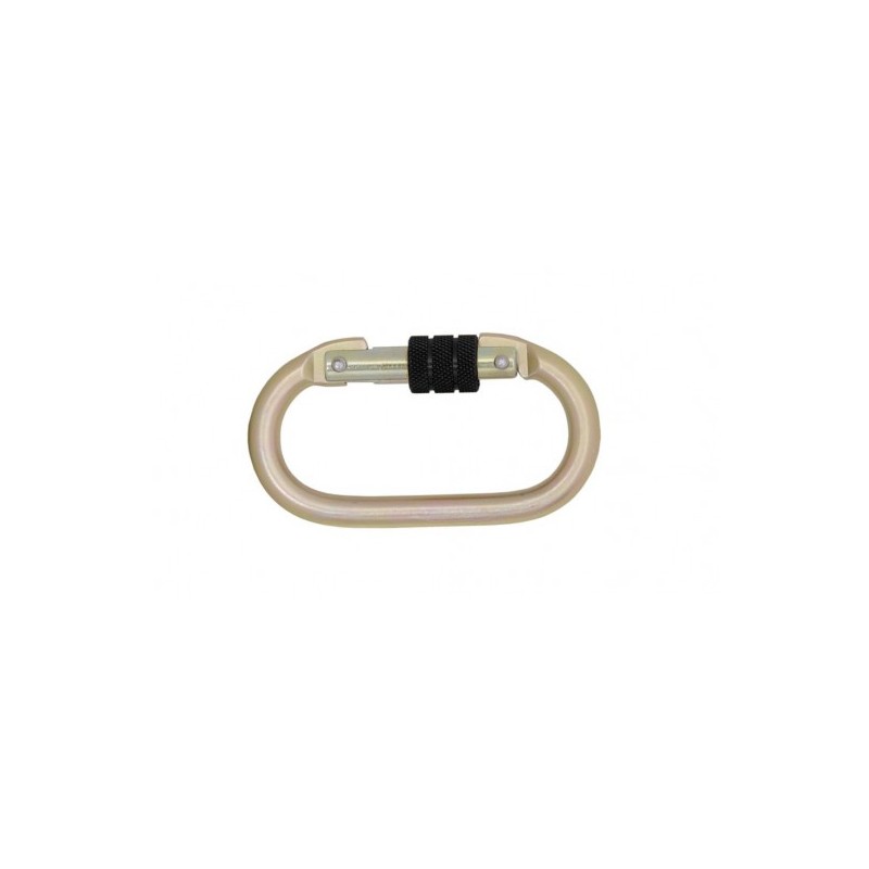 Moschettone ovale in acciaio con chiusura a vite. Apertura: 17 mm. Resistenza 25 kN. Conforme a EN362 classe B.