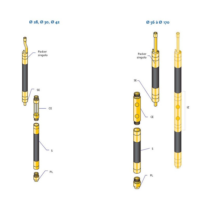 Gli elementi CE di diametro da 56 a 170 mm sono costituiti da un manicotto forato con lo stesso diametro esterno del packer. Questa caratteristica consente ai packers compattezza e assenza di asperità esterne, che li rende particolarmente adatti alle iniezioni cementizie e alle prove geotecniche di messa in pressione.