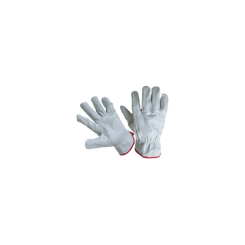 Guanto professionale anatomico a 5 dita in pelle fiore colore bianco, con elastico stringi-polso sul dorso, bordato con fettuccia. Idonei per confezionamento, spedizione merci, manipolazione casse di legno, cartone e plastica e manipolazione di utensili. Date le caratteristiche del guanto l’uso è particolarmente consigliato nell’industria in generale e nelle attività di magazzino.