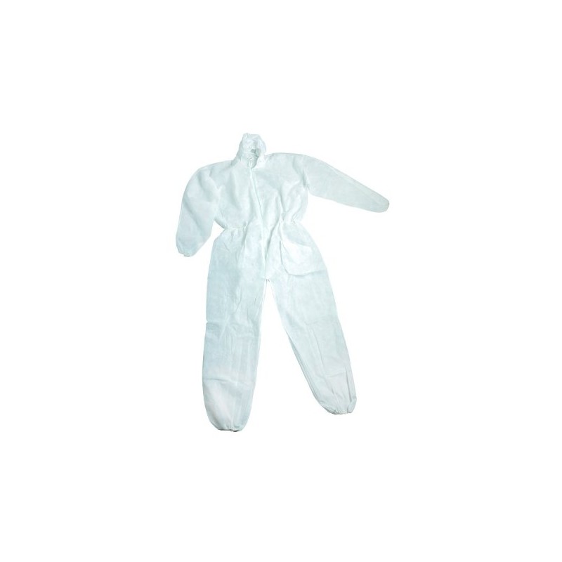 Tuta monouso in 100% polipropilene, colore bianco, cuciture esterne, cappuccio con elastico attorno al viso, elastico stringivita, polsini e caviglie con elastico, cerniera coperta da pattina. Impiego: da non utilizzarsi in ambienti pericolosi o tossici, svolge funzioni di protezione contro lo sporco. DPI di 1ª categoria.