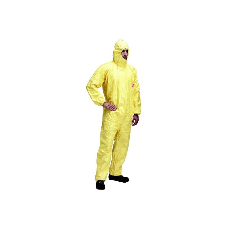 Descrizione: tuta in tessuto speciale formato da uno strato di tyvek ed un altro polimerico con cuciture ricoperte da nastro, colore giallo, cappuccio con elastico attorno al viso, polsi e caviglie con elastico, doppia pattella autoadesiva copricerniera. Impieghi: manipolazioni di polveri, acidi e basi inorganici pericolosi e spruzzi, operazioni di pulizia di imbarcazioni, condotte e cisterne con getti ad alta pressione, aerosol o spray, interventi in presenza di sangue e dei suoi agenti patogeni. DPI di 3ª categoria.