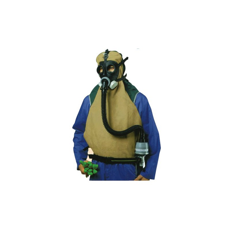 Respiratore ad aria compressa a flusso continuo. Maschera con cappuccio di gomma stampata adattabile a qualsiasi conformazione del viso e perfettamente aderente. Vetri facilmente sostituibili. Cappuccio cucito alla maschera, ha la parte anteriore spalmata in PU, la parte posteriore in forte tessuto di cotone. Protezione fino in vita. E costituito inoltre da: - Tubo corrugato TUR 609 in gomma necessario a collegare il regolatore di flusso con il facciale - Filtro EOD 55 con involucro in polipropilene antiurto. Provvede alla filtrazione di particelle solide in sospensione e vapori d’olio eventualmente presenti nell’aria in caso d’avaria o accidentale assenza del sistema di depurazione principale - Regolatore di flusso AC 95 in lega d’alluminio con raccordo a vite per il collegamento al filtro e raccordo rapido maschio per il collegamento al tubo di gomma proveniente dalla linea dell’aria compressa. Il regolatore è montato su uno scudetto di supporto applicato ad una cinghia da portare in vita.