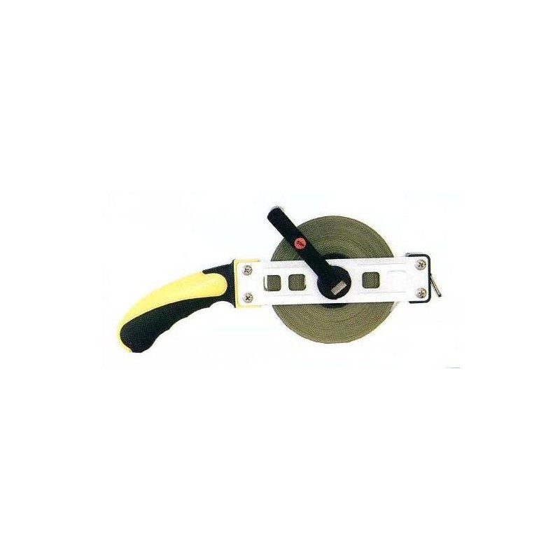 Rotella metrica con nastro in acciaio smaltato da mm 13. Grado di precisione secondo le norme CEE. CL II. Impugnatura ergonomica con inserto in gomma. Struttura in metallo. Maniglia a scatto. Nastro acciaio millimetrato metri 50.